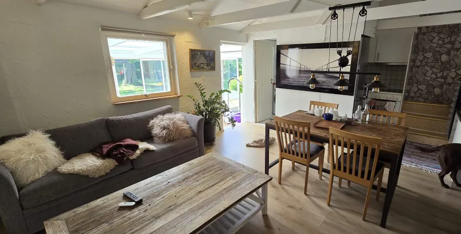 Apartment attached to a house with roofed parking space for two cars, and access to garden and terrace, floor heating and inglassed room, ideally for a couple or a small kids family or two student sharing. . It is a one floor apartment attached to a house with private accesses, the space is 67 square meters including the inglasade room. . It consists of a bedroom, a living room combined with bedroom 2 (multifunction), a sun glass room towards to the garden and a big terrace and garden.. Bedroom 1 and living room (also named as bedroom 2) are separated with a sliding door. There are two beds in the bedroom 1 with a curtain separation. One bed is 1.8 meters wide and the other one is 1.2 meters wide. Living room (bedroom 2) to the sun room is separated with normal door. There is a sofa which can be extended as a 1.6meters wide bed. . 1. You can cook since the kitchen is equipped with stove, fridge, microwave oven, coffee machine and press coffee, water boiler and other necessities.. Barbecue in the garden is also available. . 2. Laundry and drier available.. 3. Big TV to entertain you during your stay. You can chromecast TV channels, movies or youtube, Netflix to the TV with your own smartphone.. Wifi:. Fast, Free. Electricity, water, parking:. Free. Location:. Close to the center of Malmö and high way. Close to recreation park. Easy access to everywhere in the city within 20 minutes by public transfer or bike, Copenhagen and Lund within one hour maximum. Free and private parking, floor heating 19-24 degrees (Nov-Apr) , private kitchen, shower, toilet, washing machine and sun room, large terrace and garden. Nearest train station is called triangle station . Nearest bus station is called Dalvik.. Bus number 6 reaches to the destination.. You can check